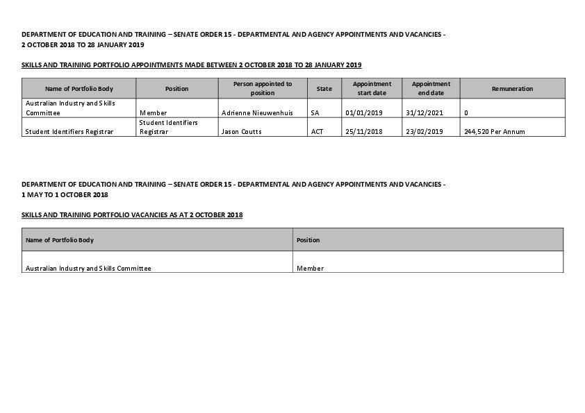 Senate Order 15 - 2 October 2018 to 28 January 2019 - Skills and Training
